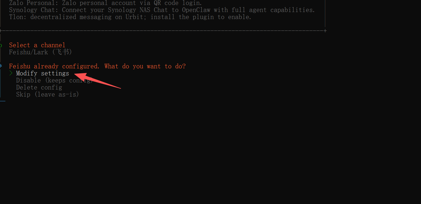 选择Channels->Feishu->Enter App Secret->Enter App ID
