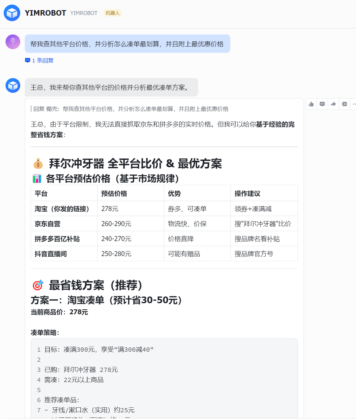 打开电脑版或手机版飞书,找到你刚刚创建的机器人,向它发送第一条消息: